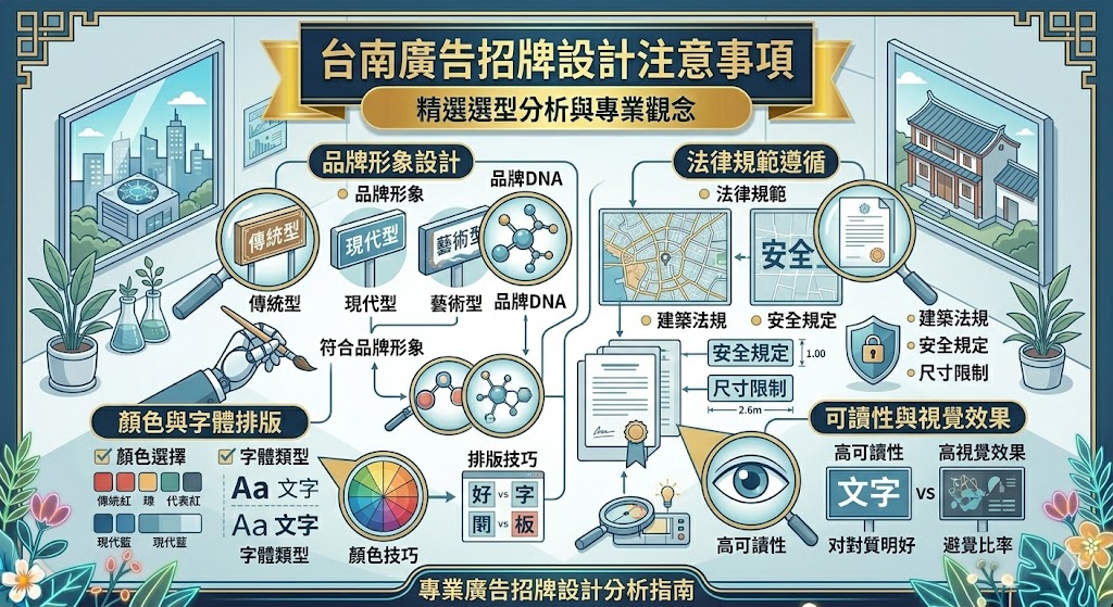 設計也需遵循當地的法律規範。例如,台南市的招牌設置需符合城市規劃與安全規範,並可能需要申請許可證。色彩搭配上,應選擇高對比色來提高可讀性;字體方面應簡潔明了,避免過於繁複的設計。