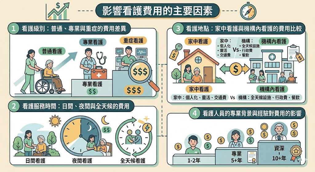 - 日間看護:通常為最經濟的選擇。 - 夜間看護:夜間服務價格一般會較高,因為服務時間長且需支付額外的夜間津貼。 - 全天候看護:提供24小時不間斷照護,費用會是最昂貴的選項。